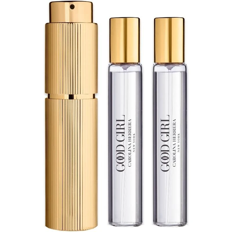 Carolina Herrera Good Girl EDP Travel Spray er et lækkert sæt der indeholder 3 x 20 ml parfume. Dette betyder at der medfølger en lille guldflakon der passer perfekt i håndtasken og som du kan sætte dine små flasker i så du kan have dem med over alt, og friske din duft op efter behov. Denne eau de parfum er en yderst eksklusiv duft til kvinden, som hviler i sig selv. Duften er skabt ud fra visionen om dualitet ved den moderne kvinde; dristig og sexet, elegant og gådefuld, god og ond. Den skubber og krydser grænser, hvilket gør Good Girl til en både moderne og sofistikeret duft. Selve flakonen, den ikoniske stilet med den meget dominerende hæl, er det ultimative symbol på magt, som fører til lidenskab med sin ekstreme sensualitet.