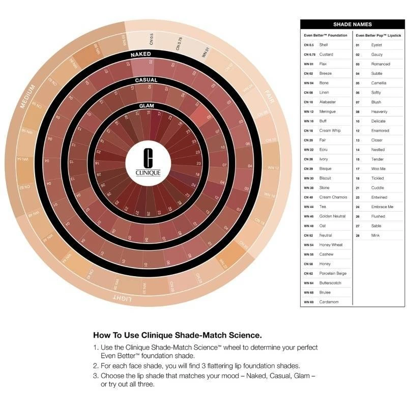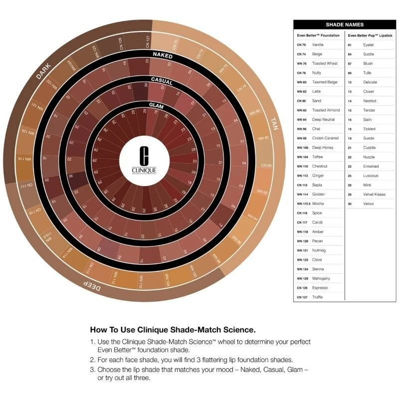 Dette er selvfølgelig bare en guideline, og det er ikke et must, at man bruger hverken Even Better Foundation eller hjulet. Clinique Even Better Pop Lip Colour Foundation findes i mange super flotte nuancer, så der er rig mulighed for at finde en eller flere farver, som passer til netop dig. Lad dig forføre af de smukke farver, og brug eventuelt hjulet til at finde de helt rette nuancer.