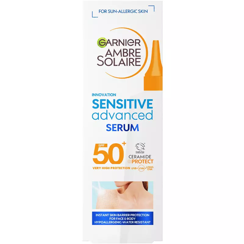 Garnier Ambre Solaire Sensitive Advance Body Serum SPF 50+ er en meget let og vandresistent solcreme, som er særlig velegnet til sensitiv, solintolerant og reaktiv hud. Den er udviklet med en hypoallergen og parfumefri formel, som kan bruges både i ansigtet og på kroppen, og er ideel til områder, som har stor risiko for at blive solskoldet f.eks. nakke, bryst, skuldre og arme.