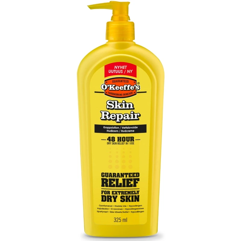 O’Keeffe’s Skin Repair Cream er en yderst effektiv og meget koncentreret hudlotion, der beroliger, fugter og reparerer ekstrem tør og kløende hud. Den er også perfekt til beskadiget, irriteret og hård hud. Cremen fugter og beskytter mod tørhed i helt op til 48 timer med kun en applikation. Cremen påføres let og absorberes hurtigt i huden. Hudens naturlige barriere kan blive beskadiget, hvilket fører til øget vandtab, der forårsager tør, kløende hud. O’Keeffe’s Skin Repair Cream beskytter ikke kun huden mod yderligere vandtab, men trækker også fugt ind i huden. Den beskyttende barriere forsegler fugten, hvilket reducerer fordampningshastigheden.